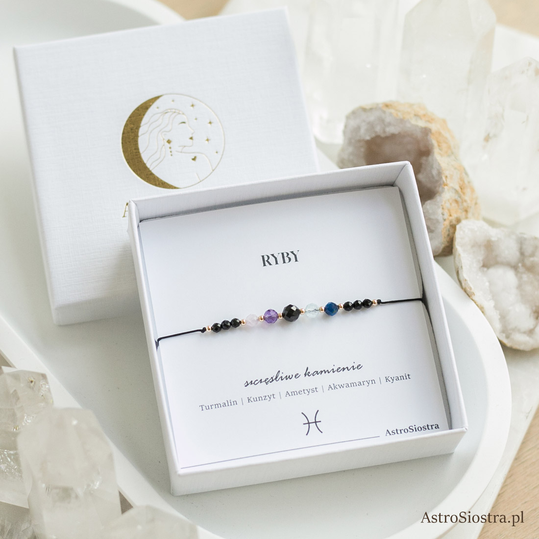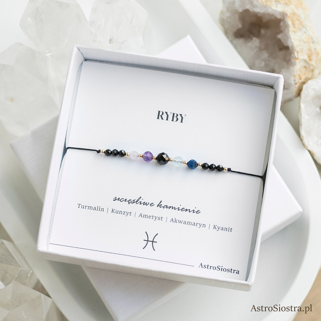 WIELKOŚĆ KAMIENI: Turmalin w centrum bransoletki 5 mm. Kunzyt, Ametyst, Akwamaryn i Kyanit około 4 mm. Oraz Turmalin czarny 3,5 mm.