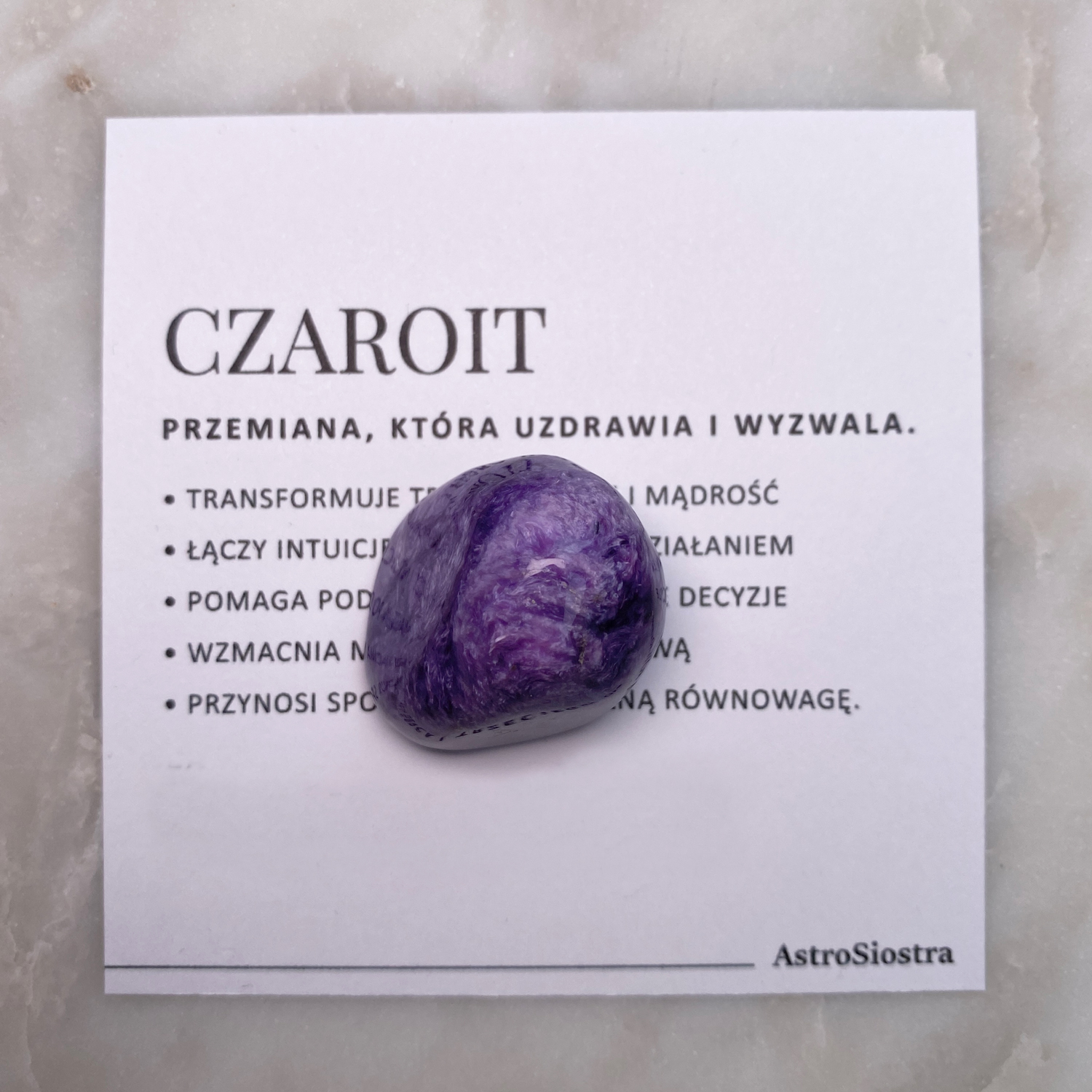 Czaroit słynie ze swojej potężnej energii ochronnej i transformującej. Uważany za kamień przemiany, pomaga uwolnić się od lęków, wspiera spokój wewnętrzny oraz harmonizuje ciało i umysł. Otwiera serce na miłość, pogłębia intuicję i chroni przed negatywnymi wpływami zewnętrznymi.